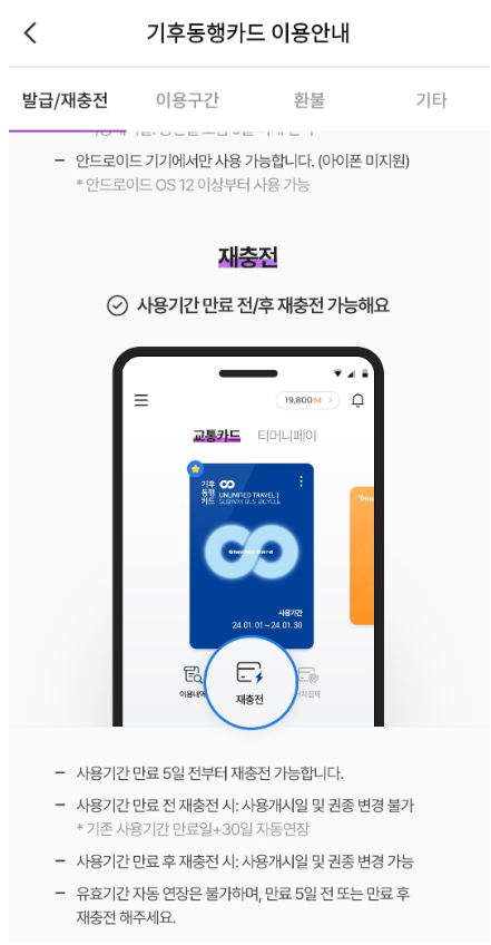 모바일 티머니앱을 사용할 경우, 충전은 체크/신용카.드와 계좌이체 모두 가능합니다. 충전시기는 사용기간이 만료되기 5일전부터 가능합니다.
