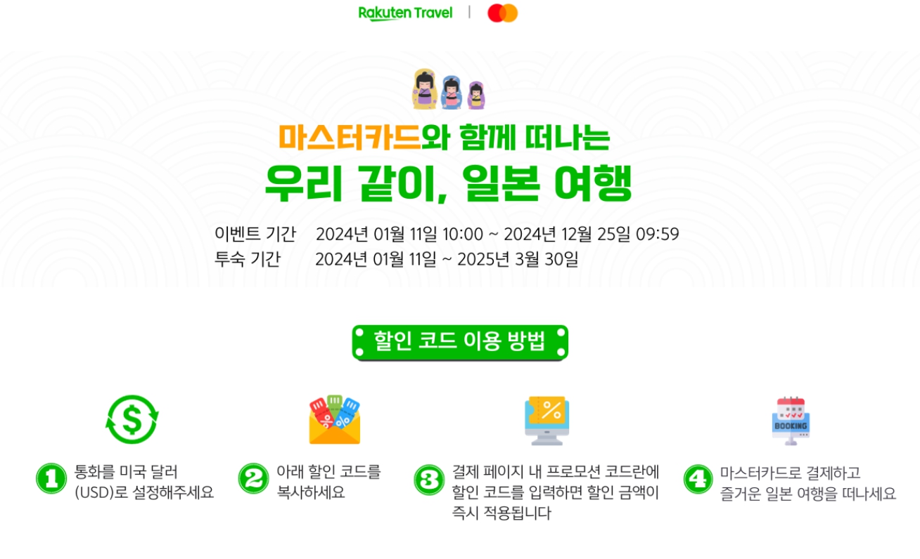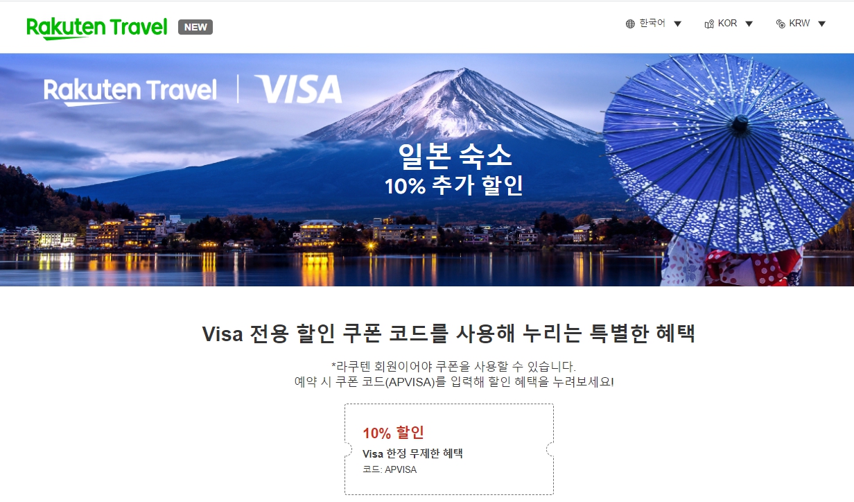 라쿠텐 트래블에서 중복으로 10% 할인을 더 받을 수 있는 이벤트를 진행하고 있습니다.
