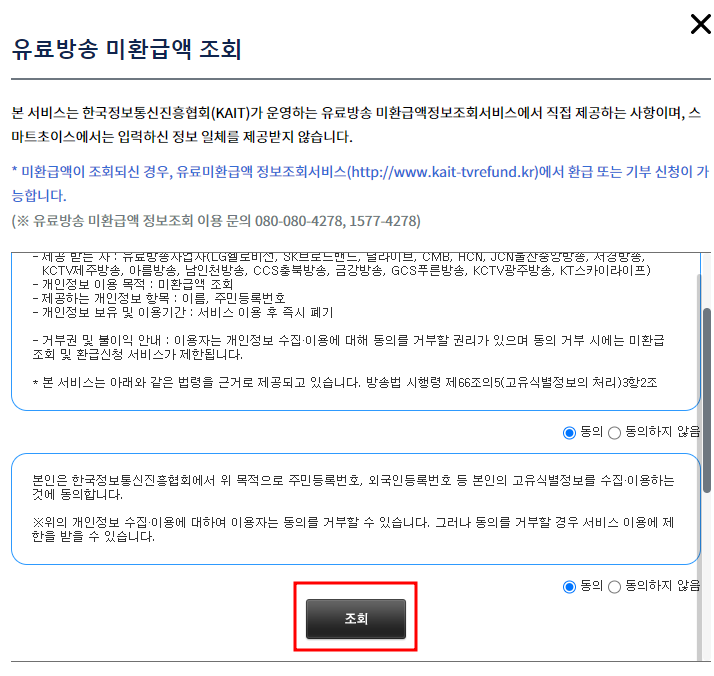 그리고나서 개인정보 이용에 동의를 선택하신 후,  [조회]를 클릭하면 나의 유료방송 미환급액도 확인할 수 있습니다.