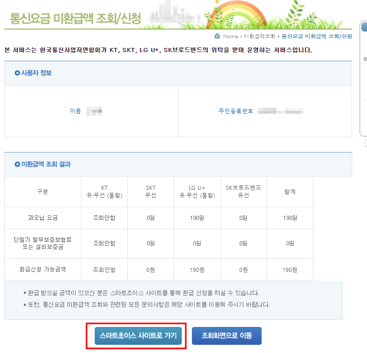 통신요금 미환급액 조회 결과를 확인했을 때, 과오납요금이 있으면 당연히 환급금 신청을 할 수 있습니다. 이때 [스마트초이스 사이트로 가기] 버튼을 클릭하셔서 신청하셔야 됩니다.