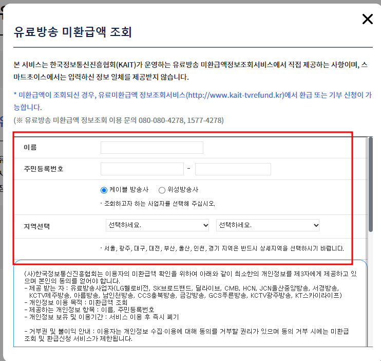 위 링크를 통해 [유료방송 미환급액 조회]에 들어가서 이름, 주민등록번호, 방송사를 선택한 후, 방송을 시청하는 지역도 선택해 주세요.