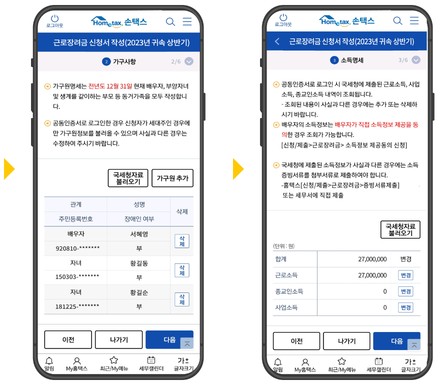 신청/제출 → 근로장려금 반기신청 → 신청하기 → 로그인하여 신청 → 인적·가구사항 → 소득명세 작성 → 전세금 명세 → 계좌번호 작성 → 신청확인 및 전송